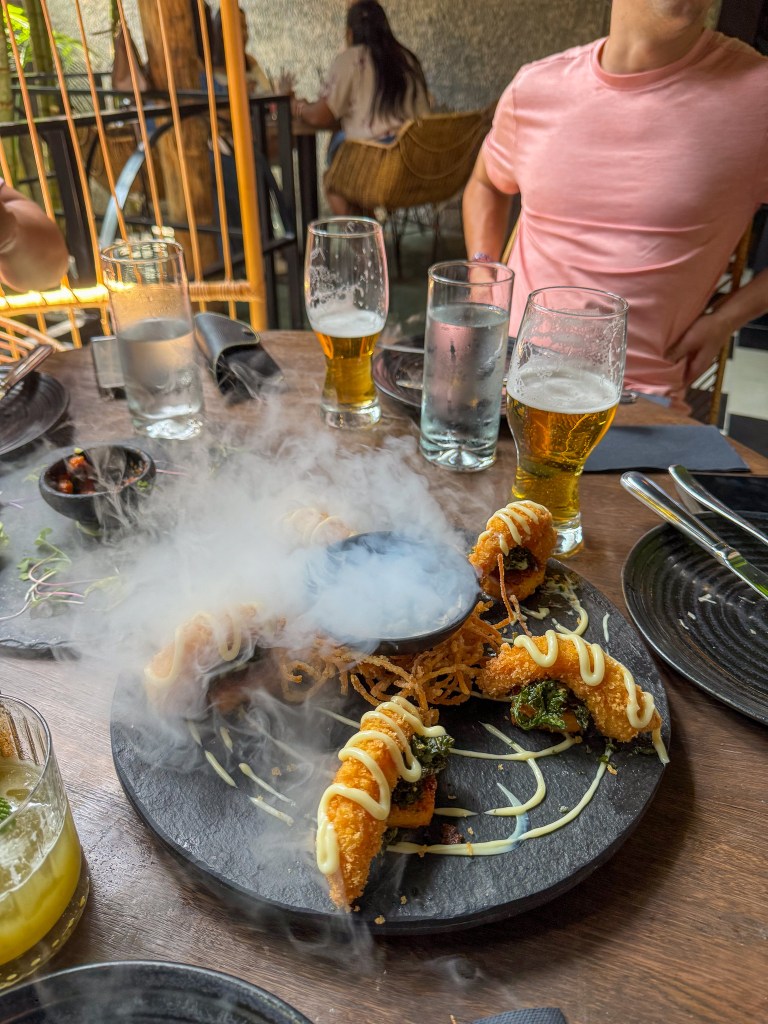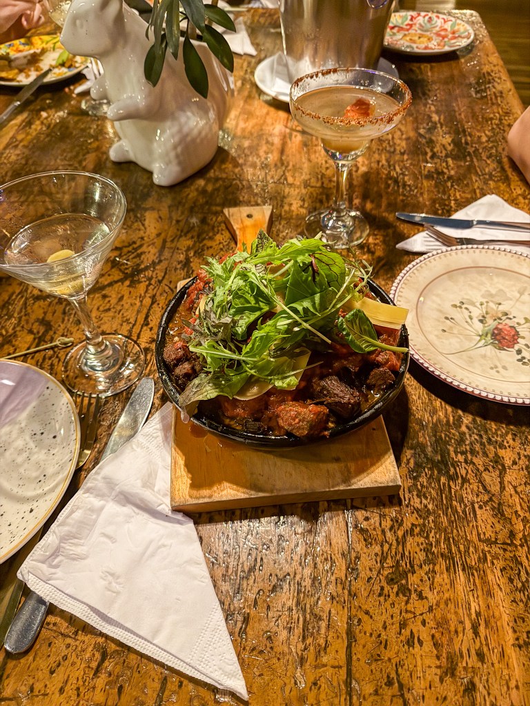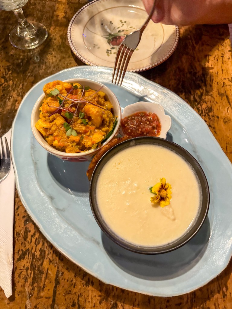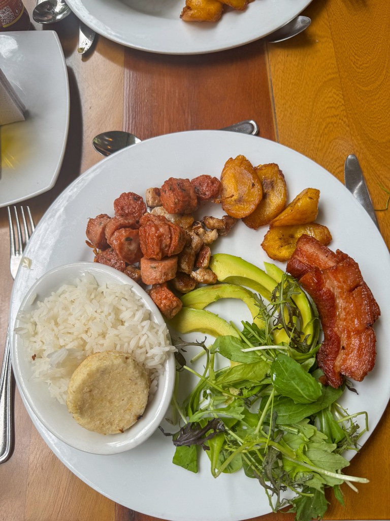 We headed back to El Poblado at night, where we watched a local dance performance at the park and then had dinner at Alambique. Before I dive into everything we ate in Colombia, let me preface it by saying the food is a gastronomic delight. I rarely ate something I didn’t like or that wasn’t good. The food was incredible, fresh, and plentiful. I found that we often over-ordered, but because it was so good, I didn’t feel horrible when I inevitably tried clearing my plate. Pork and seafood are prevalent. The national dish of Colombia is bandeja paisa, which typically contains pork belly, beans, rice, plantains, sausage, avocado, rice, and sometimes a mini arepa.
